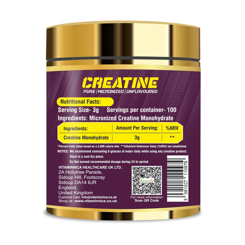 Vitaminnica Micronized Creatine Monohydrate 200 mesh, Pre & Post Workout for Performance and Muscle Power | Unflavoured |100 Servings, 300 Grams