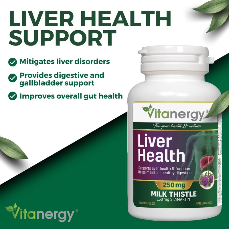 Vitanergy Liver Health- Support Healthy Liver and Liver Detox, Milk Thistle, Dandelion and Turmeric Herbal Supplement, 250mg, 90 Capsules, Easy to Swallow, No After Taste, Non-GMO, Gluten Free, Made in Canada