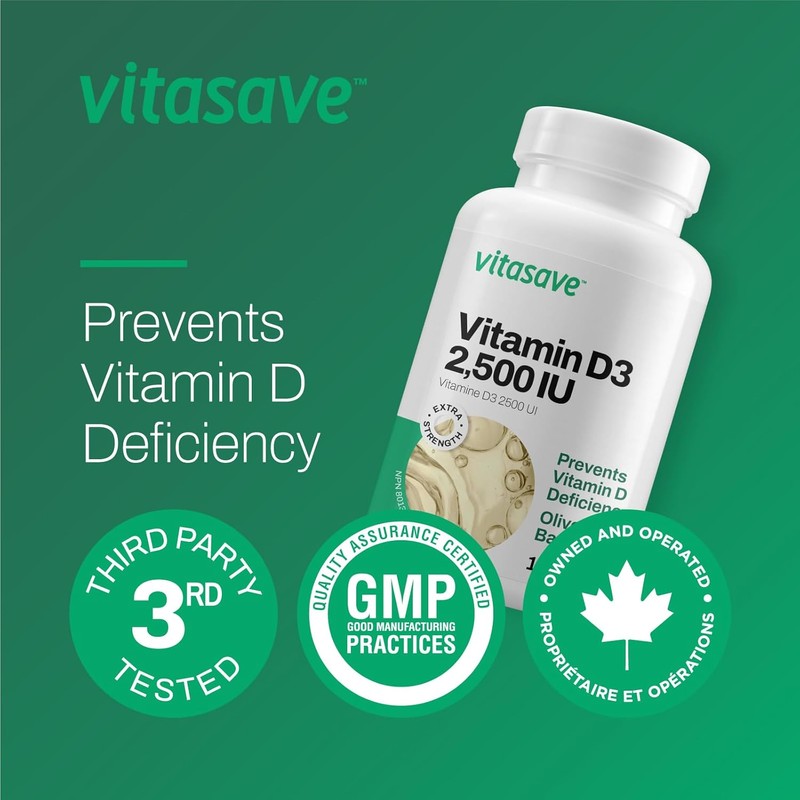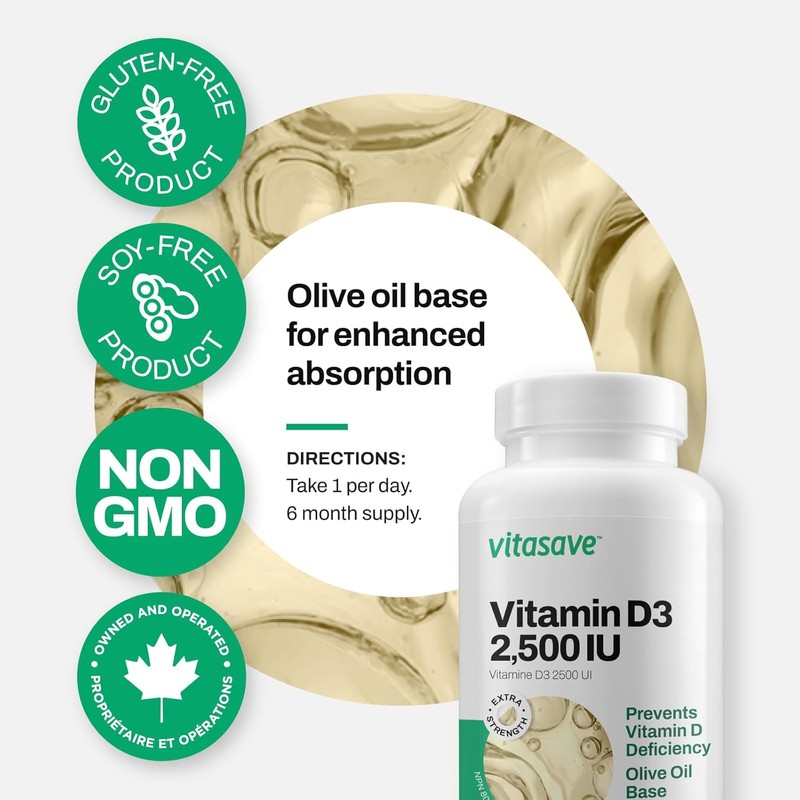 Vitasave Vitamin D3 2500 IU | High-Potency Immune Support, Bone Health & Mood Balance | Enhanced Absorption with Olive Oil | Non-GMO, Gluten-Free | 180 Softgels