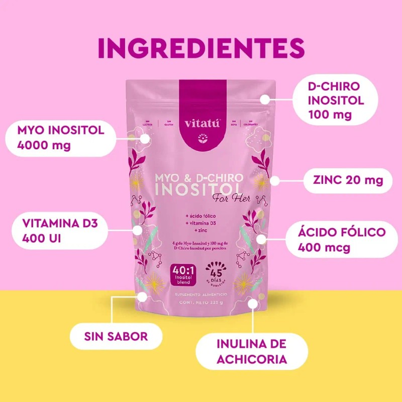 - 🌷 MYO & D CHIRO INOSITOL VITATÚ es un suplemento diseñado para mujeres a base de Myo Inositol, D-Chiro Inositol, Zinc, Folato y Vitamina D3. ✨Relación óptima 40:1 de Myo + D-Chiro Inositol. 4 g Myo Inositol por porción + 1 g D-Chiro Inositol por porción. Muy fácil y práctico de consumir, 2 scoops al día, 1 scoop por la mañana & 1 scoop por la noche en agua después de los alimentos.