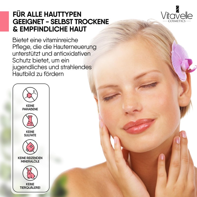 - Made in Germany quality – at Vitavelle, we do not carry out animal testing, as we believe in ethical and sustainable beauty practices. Our moisturiser is made in Germany in compliance with strict quality standards and only with tested, proven ingredients.