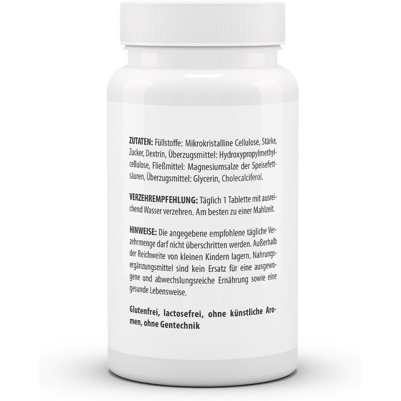 - Ingredients: Fillers: microcrystalline cellulose, starch, sugar, dextrin, coating agent: hydroxypropylmethylcellulose, flow agent: magnesium salts of fatty acids, coating agent: glycerin, vitamin D3