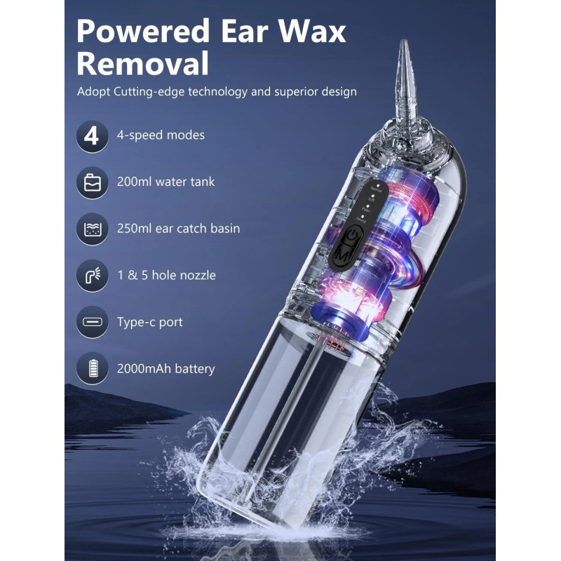 Ear cleaner normal, gentle, pulsating and strong. Gentle for sensitive ears, normal for daily cleaning and care, pulse mode for soothing ear massage, strong for cleaning stubborn earwax. You can select the most suitable ear irrigation mode for cleaning your ear canal.