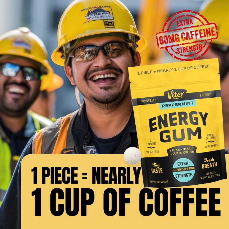 - Energy and Alertness Immediately - Viter Energy Gum helps you stay alert, energized, and focused anytime on-the-go wherever life takes you. The resealable bag of 180 pieces of gum is small enough to fit in your pocket, bag, car, or office desk so you can grab a piece of great tasting on demand energy anywhere you need it. Perfect for travel, work, out with friends, exercise and workouts, or whenever you need a caffeine kick to give you a boost without any spills, mess, or jitters.
