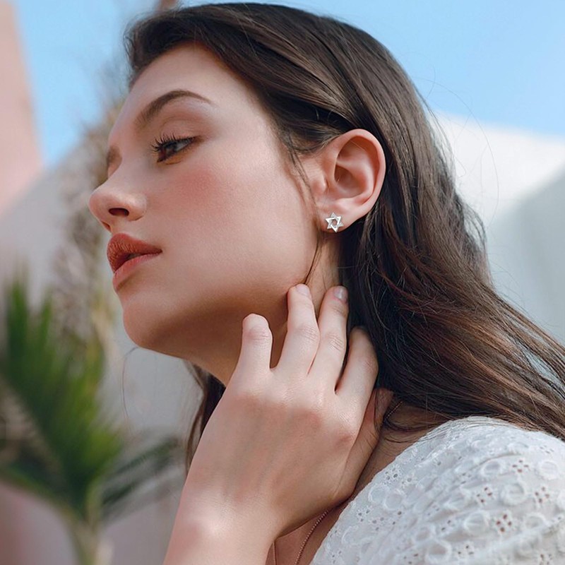 - Star of David Earrings: The interwoven lines of the Star of David are precisely formed, giving it a symmetrical and harmonious look. The addition of zironica not only adds sparkle but is also expertly set to enhance the overall beauty and elegance of the earrings. The combination of the classic symbol and the brilliant zironica creates a piece that is both timeless and captivating.
