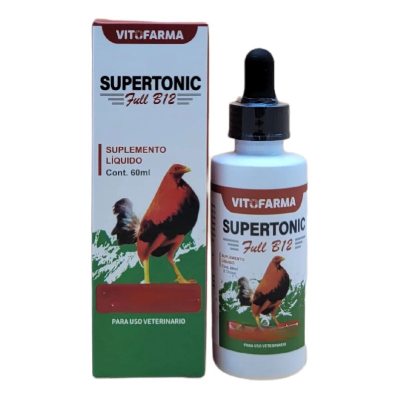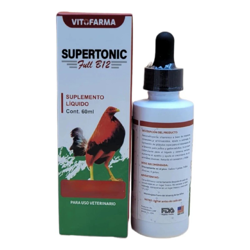Supertónico vitaminado completo B12 60 ml para gallos. Recuperación y balance. Reconstituyente vitamínico a base de vitaminas, minerales y aminoácidos, ayuda a estimular la formación de glóbulos rojos para tratar anemia en gallinas y gallos adultos.Buen estimulante del hígado y sistema nervioso. Aumenta el apetito y favorece el crecimiento de animales jóvenes.Retarda cansancio y fatiga.Fecha de expiración: 11/24Reconstituyente vitamínico para gallos.