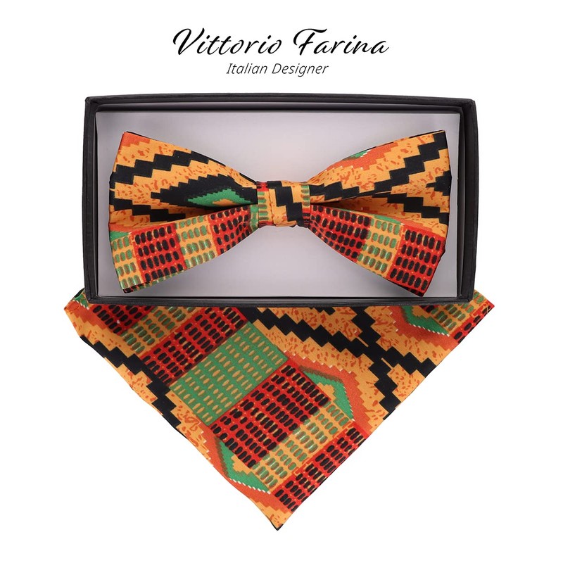 Vittorio Farina Premium African Kente Pre-Tied Bow Ties for Men & Pocket Square Set