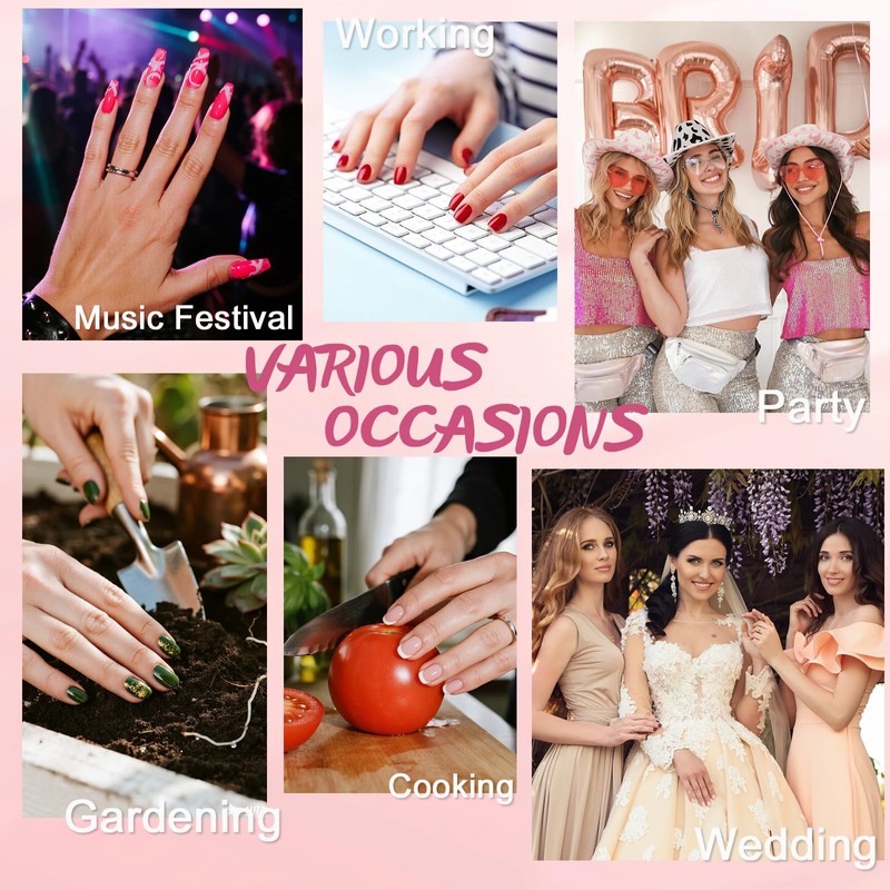 ✅Press on nails are designed according to the curvature of women's nails. They not only fit your nail bed perfectly, making your nails look natural, but also make you feel comfortable even if you wear them for a long time.