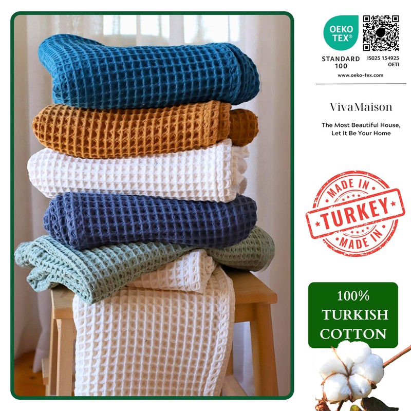 - PURE 100% TURKISH COTTON: Viva Maison's waffle bath towels are meticulously crafted in TURKEY by a factory with OEKO-TEX certification - Treat yourself to unmatched comfort and premium quality with our quality, soft and lightweight waffle weave bath towels made from long-staple Turkish cotton.