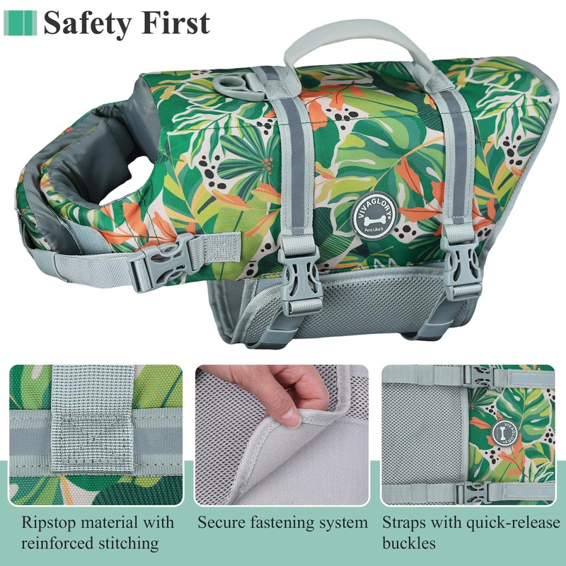 - FOR YOUR DOG'S SAFETY: The VIVAGLORY dog life jacket is constructed with extra padding to provide strong buoyancy in the water without restricting your dog's movement. Your dog will feel at ease while swimming or engaging in other water activities. The hook and loop system around the belly and neck will securely fasten the life vest to your dog