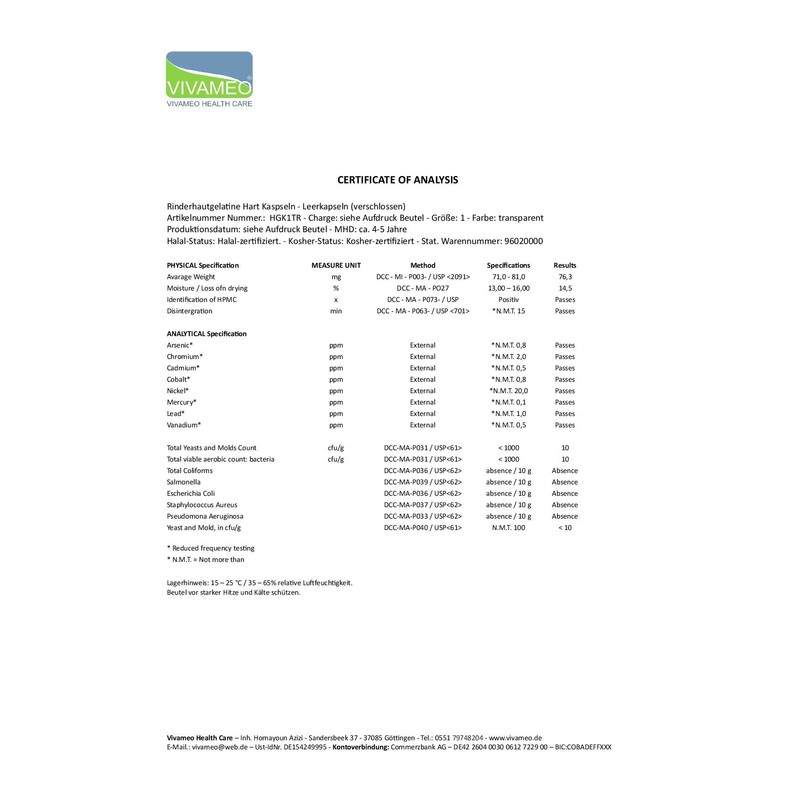 Note: The capsules are not suitable for filling liquids. Protect from strong heat and splashes of water. Optimum storage temperature is between 15 - 30 °C. The capsules are not gastric juice resistant and dissolve in the stomach.