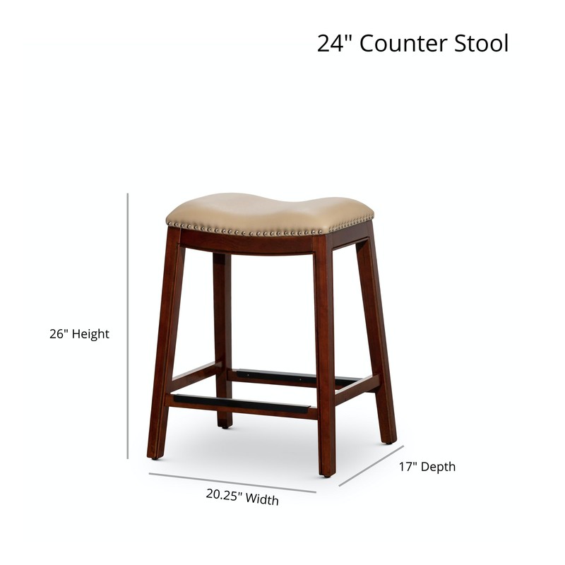 This 24-inch counter height saddle stool features a uniquely contoured seat that provides exceptional comfort, making it the perfect spot for lingering over meals or enjoying drinks with friends. The soft bonded leather upholstery, complemented by hand-tacked nail head trim, adds a touch of to any dining space.