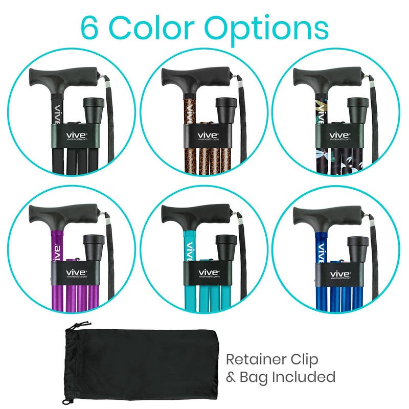 - COLLAPSIBLE & COMPACT DESIGN FROM A TRUSTED BRAND: The Vive folding cane securely locks in place, providing extra stability while walking on any surface. Folding at three points, this collapsible cane fits easily into purses, briefcases, carry-ons, or wheelchair bags for on-the-go assistance.