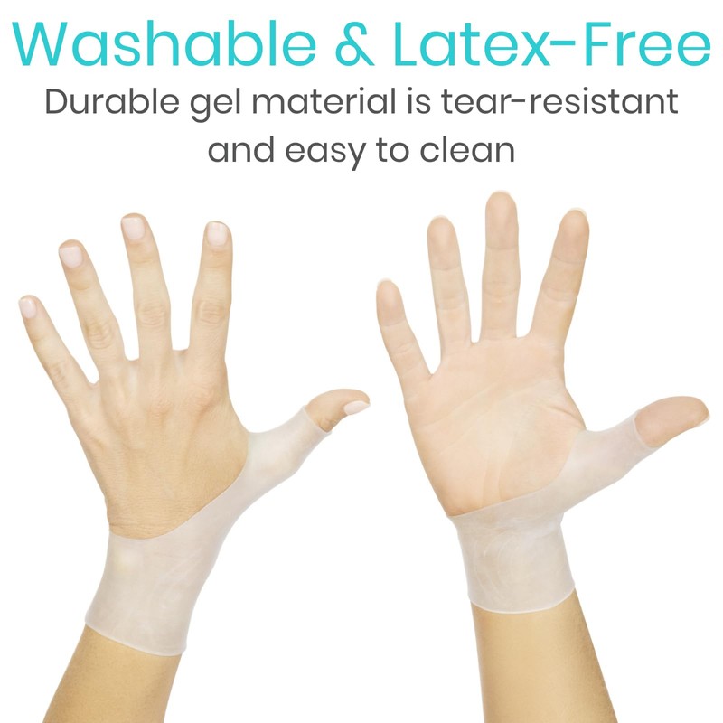 - LIGHTWEIGHT GEL: Constructed with a durable, medical grade gel material, the stabilizing wrist and thumb brace is waterproof. Easy to clean, the gel is tear-resistant, lightweight and odor-free for comfortable all-day wear.