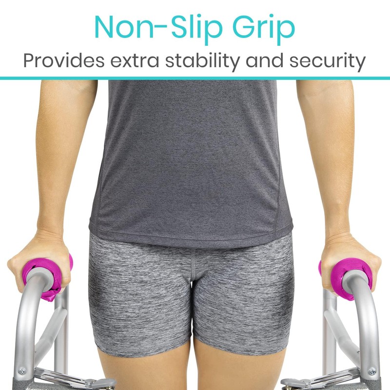- COMFORTABLY PADDED HAND GRIPS: Reducing hand and wrist pain and fatigue, the walker hand grips are padded with a contoured foam for a comfortable and secure grip. Generously padded, the walker hand grips relieve soreness and irritation caused by standard walker handles. The latex-free padded walker handles easily install on any walker with a simple hook and loop closure, providing a stable, nonslip surface for your hands to rest on a walker or other mobility device.