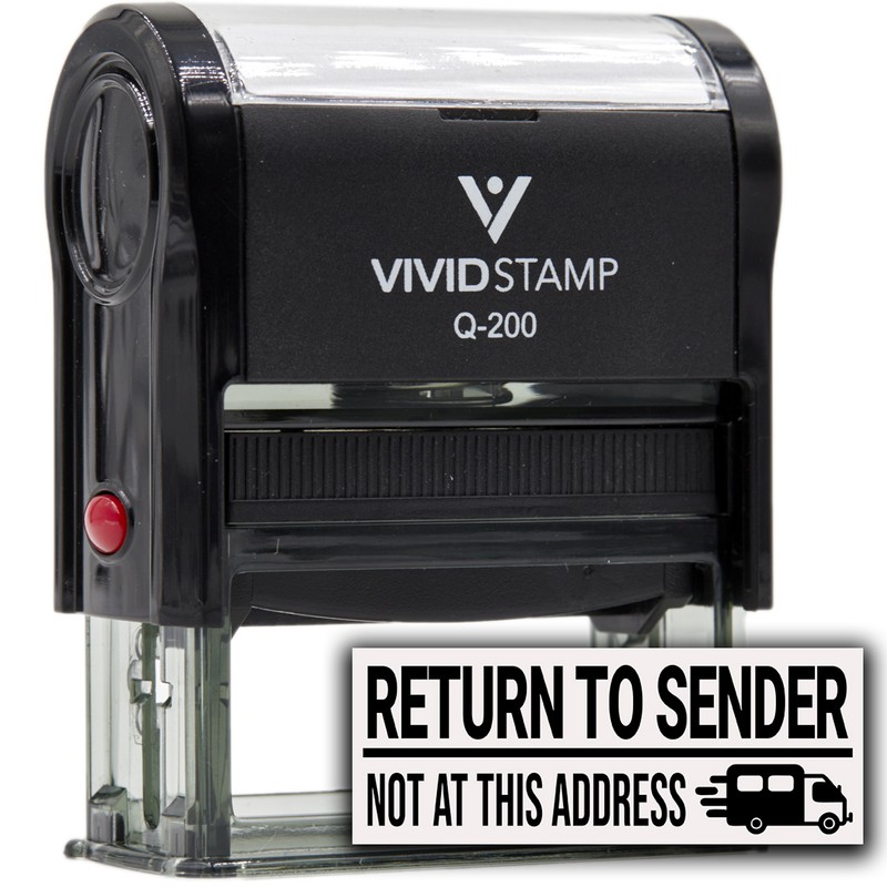 Return To Sender Not At This Address (Mail Van) Self Inking Rubber Stamp. Provides thousands of Impressions. Re-inkable stamp with Transparent bottom allow for precise stamp alignment. Comes in multiple colors.