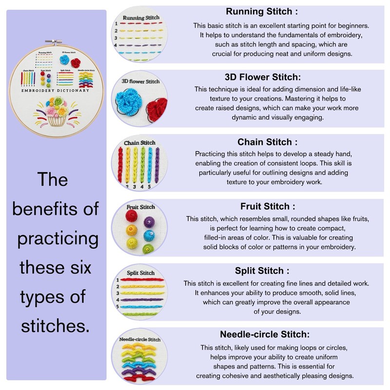 - 🌼20 Essential Stitching Techniques: 3D Flower Stitch, Fruit Stitch, Needle-circle Stitch, Running Stitch, Split Stitch, Daisy Stitch, Straight Line Stitch, Cartwheel Stitch, Cobweb Rose Stitch, Ribbed Spiderweb Stitch, Fancy Free Stitch, Buttonhole Stitch, Feather Stitch, Coral Stitch, Chain Stitch, Leaf Stitch, Back Line Stitch, Satin Stitch, Outline Stitch, French Knot Stitch.