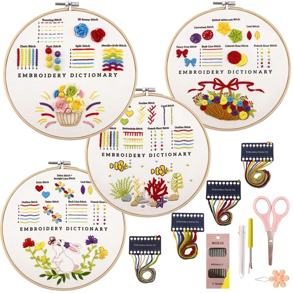 VIVIDOX 4 Sets Embroidery Kit for Beginners with Stitch Video, Cross Stitch Kits for Adults, Hand Craft Lover, Starters Easy Practice with Stamped Pattern, Hoop, Needles, Scissors, Tools & Instruction