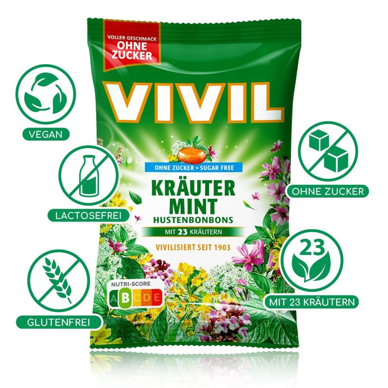 VIVIL Herbal Mint with 23 Herbs, 5 Bags, Cough Drops with Herb Flavour, Sugar-Free & Vegan, 5 x 120 g