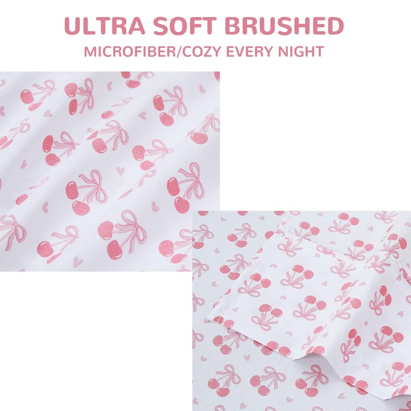 Viviland 3 Pieces Girls Pink Twin Sheet Set - Soft Microfiber Fitted Flat Sheets & Pillowcase - Pink Cherry Bow Print Bedding Sets - for Kids & Toddlers