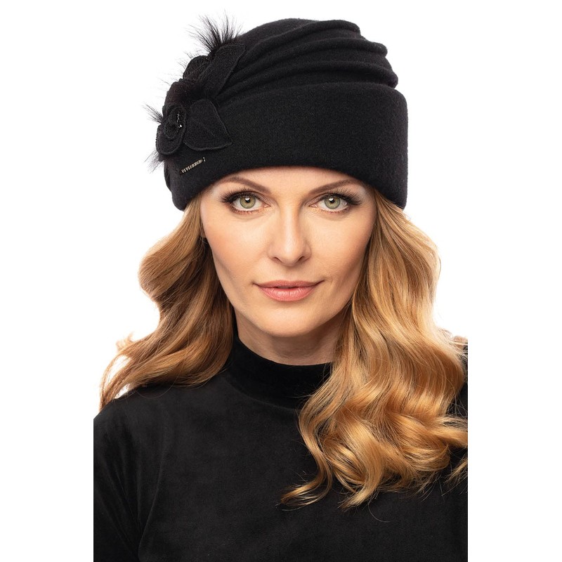 VIVISENCE Women's Winter Toque Made of Wool Handmade Autumn Warm Hat with Flower Appliqué for Women Pearls Perfect Fit Ideal for Cold Winter Days Model 7058, black