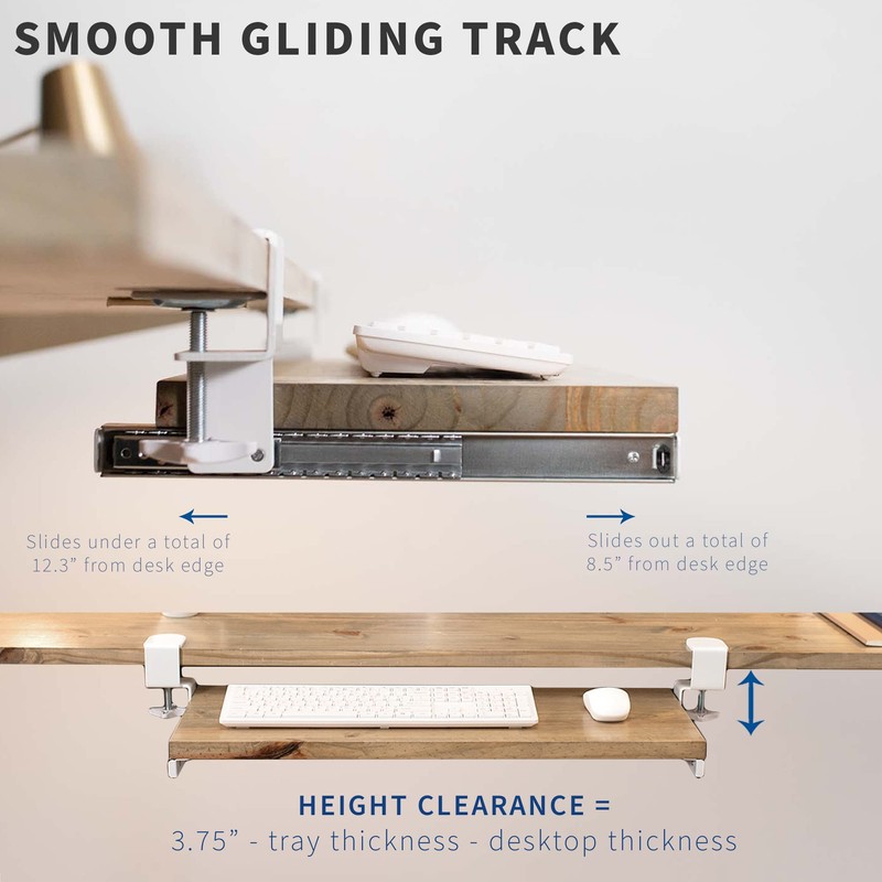 - DIY Customized Design - Save desk space by transforming your very own keyboard tray (at least 10.5” in width, 0.6” in thickness, and up to 11 lbs in weight) into an under desk sliding tray with this durable set of clamp-on rails. Package includes 2 slider tracks, 2 C-clamps with padding, and mounting hardware.