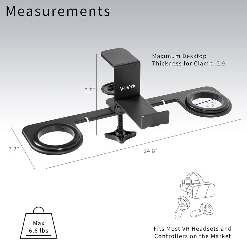 - Heavy Duty Clamp - Secure this headset and controller display holder to your desk with no drilling required. The sturdy C-clamp fits desktops and other surfaces up to 2.9” in thickness, ensuring your next virtual reality adventure is always within arm’s reach.
