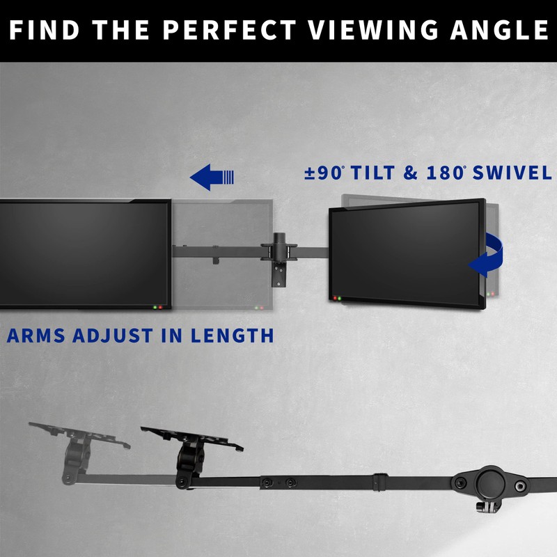 - Articulation & Height Adjustment - Adjustable mount offers +90° to -90° tilt, 180° swivel, and 360° rotation for comfortable viewing angles. Monitors can be placed in portrait or landscape orientation.
