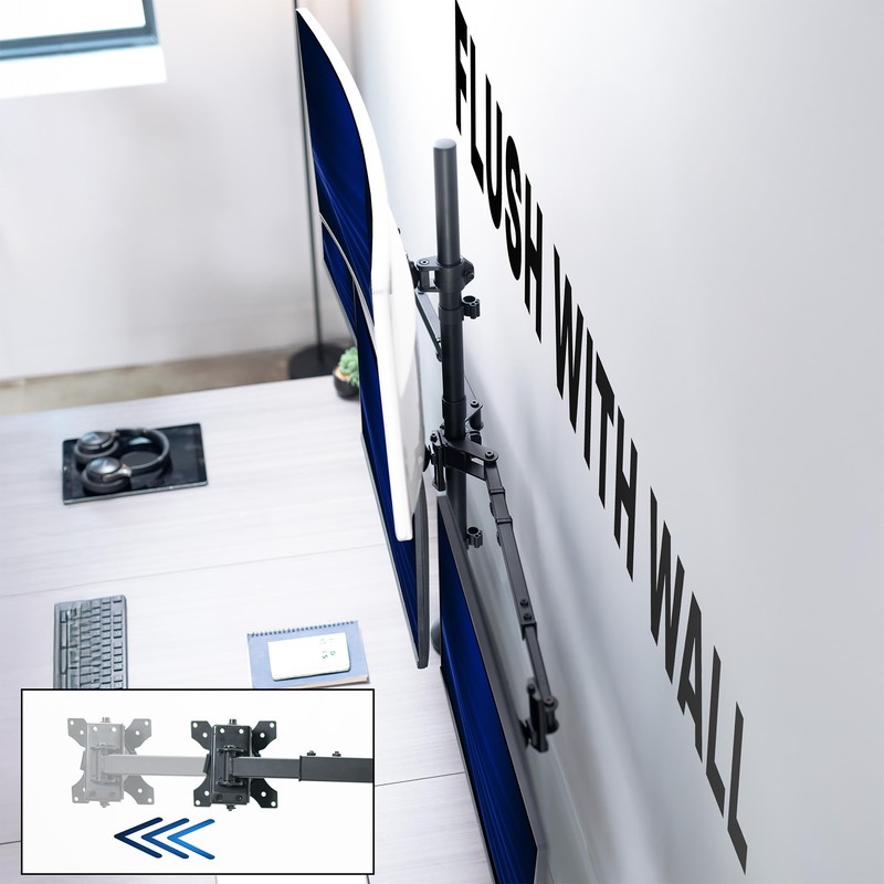 - Premium Telescoping Arms for Flush Setup: Unique telescoping design expands arms straight outwards so that nothing extends past the back edge of your desk, creating a flush-to-wall setup. The arms slide into each other for added strength and stability