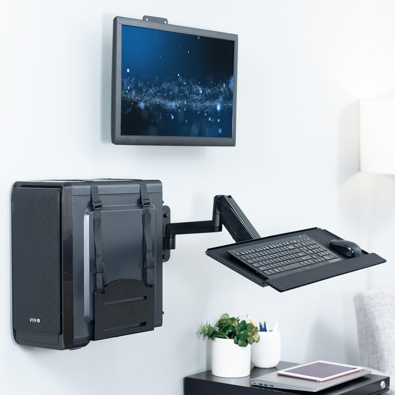 - Sturdy & Low Profile - The monitor mount sits only 2” from the wall, while the keyboard tray can be folded up to save space and make hassle-free storage, positioned only 4.5” from the wall. Elevating your CPU saves floor space, and solid steel construction provides long-lasting support.