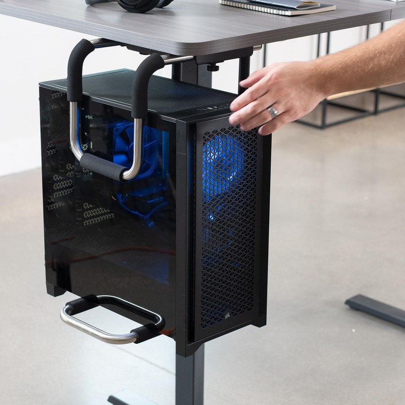 - Large Under Desk PC Mount - This CPU holder conveniently mounts your PC to the underside of a desk to conserve floor space and protect your equipment from rogue dust bunnies, accumulated dirt, and the occasional coffee spill.