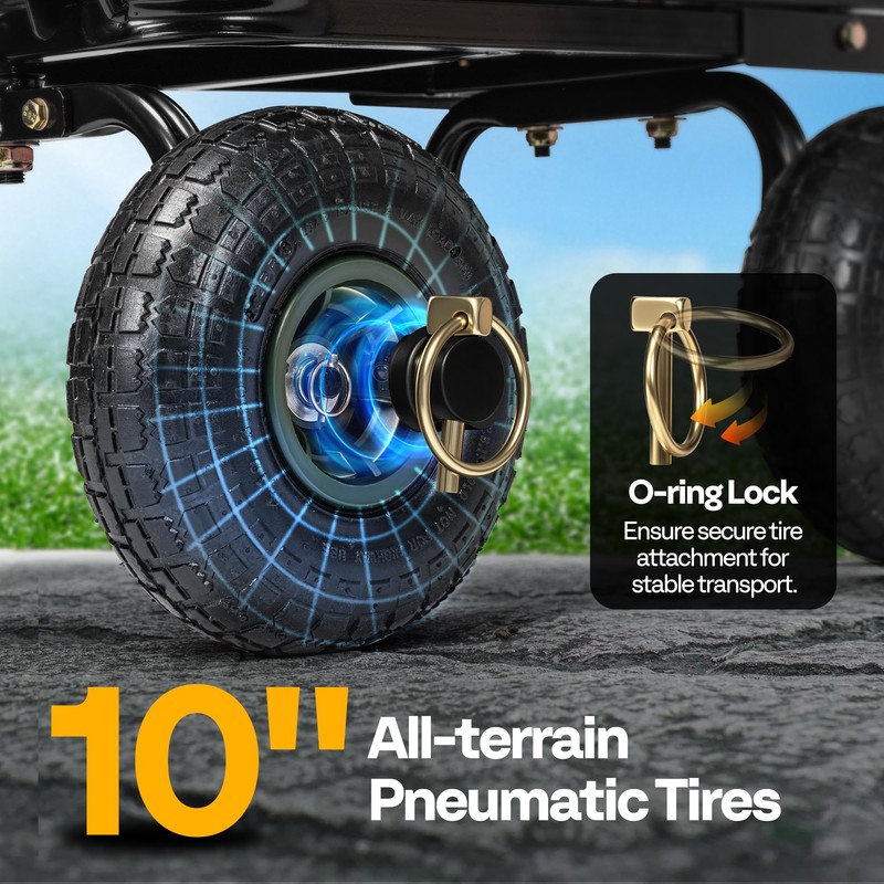- All-Terrain Pneumatic Tires: 10" pneumatic tires provide natural shock absorption and smoother rolling, reducing impact and effort when moving heavy loads; The deep tread pattern delivers superior traction and shock absorption on grass, gravel, or slope; The O-ring lock ensures secure tire attachment for stable transport
