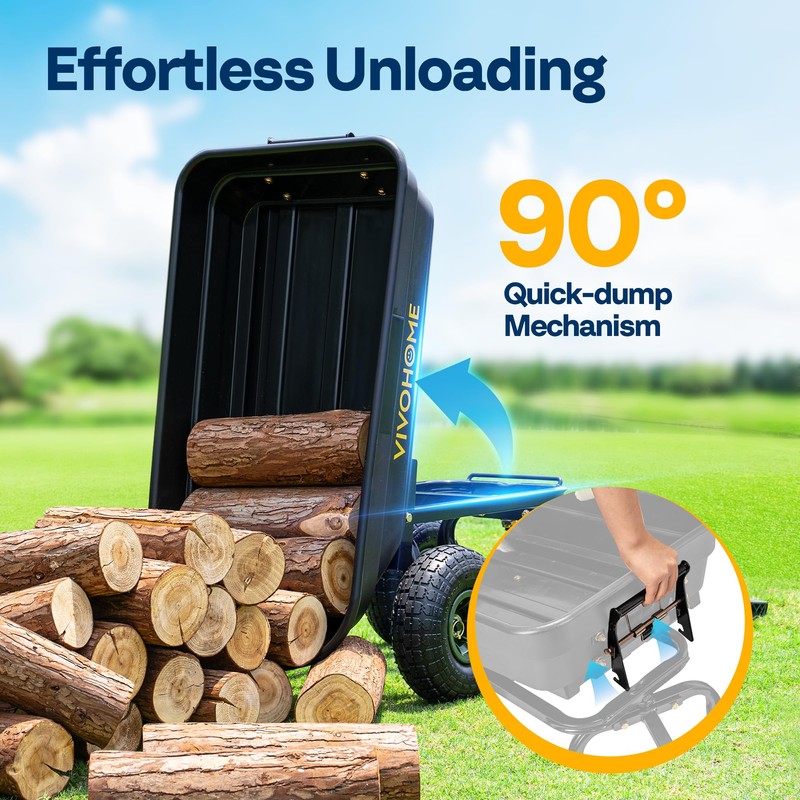 - Solid and Stable: Crafted with a reinforced 3.5mm plastic base and 3mm sidewalls, this heavy duty dump cart offers a strong and stable platform that resists bending or cracking; It supports loads up to 660 lbs (4 cu.ft), suitable for hauling soil, lumber, tools, and other yard materials; The rust-resistant steel frame ensures durability for long-term outdoor use, making it a reliable partner for tough jobs