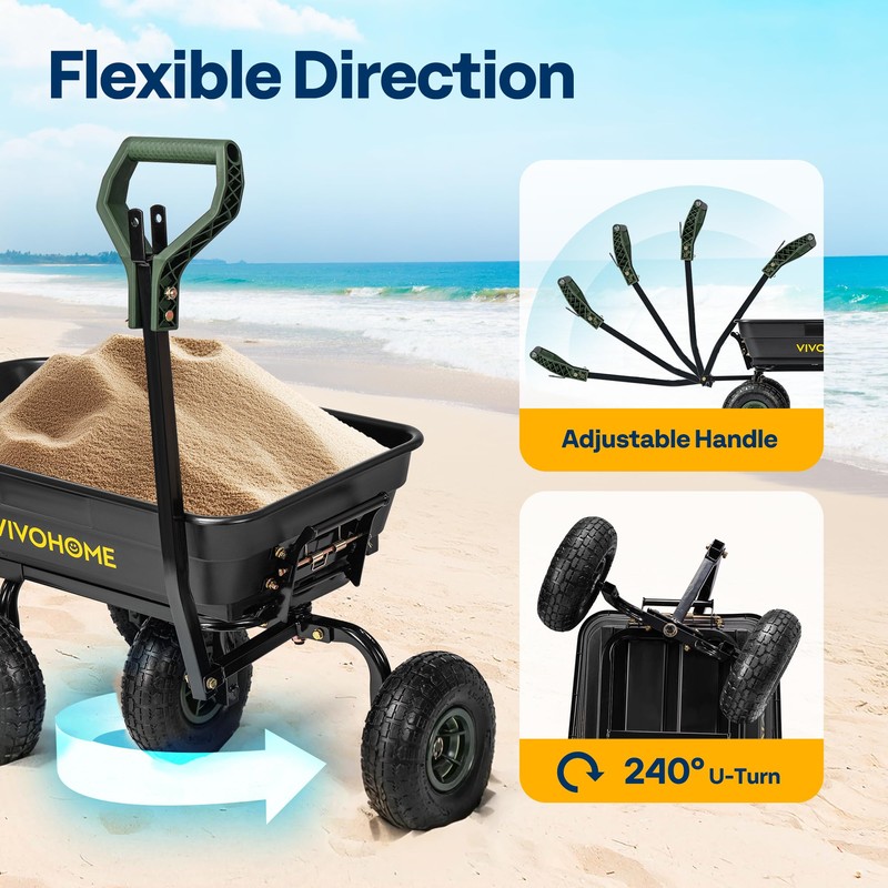 VIVOHOME 4 Cu.Ft 660lbs Wheelbarrow Garden Cart Dump Wagon with 2-in-1 Convertible Handle Attach to ATV or Tractor, 10" All Terrain Wheels, Quick Release System, Heavy Duty Utility Trailer for Yard
