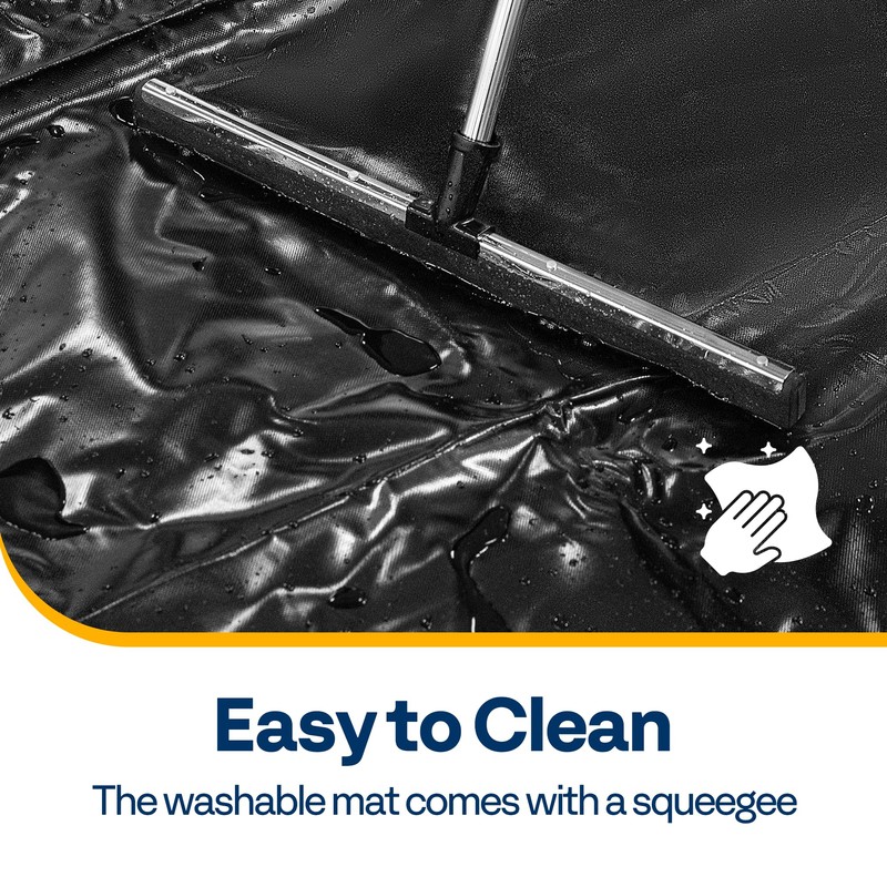 - EASY TO CLEAN: Not only does our garage mat keep your garage clean, but it is also easy to clean itself; The washable mat comes with a squeegee; When it’s time to clean the mat, drag it outside the garage to sweep with the squeegee, or hose it off; This makes it a breeze to clean and maintain your garage