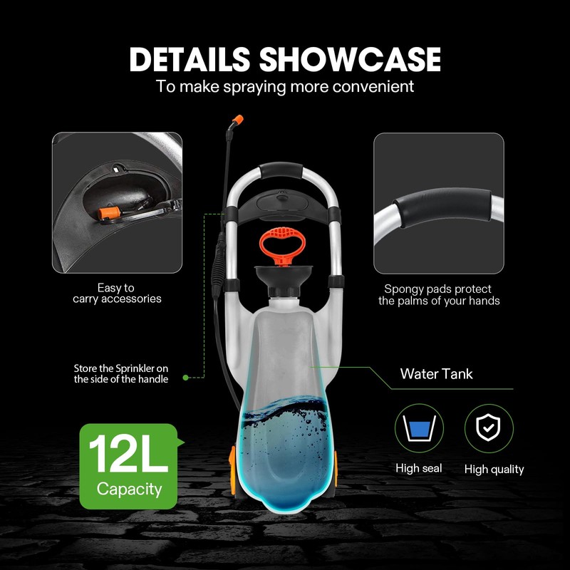- High-Quality Parts: Constructed with an aluminum alloy pull handle that resists corrosion and a comfortable spongy handle for comfort; Heavy-duty, thick plastic wheels make this sprayer easy to move across uneven ground; Reliable and won’t break during extended use
