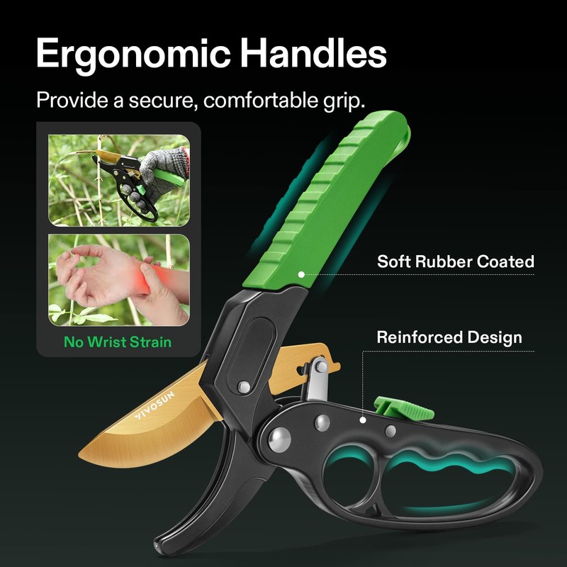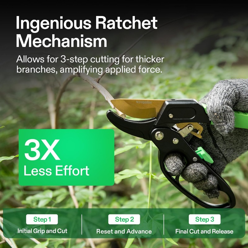- Effortless Precision Pruning: Experience unparalleled ease with our ratchet mechanism that employs a 3-step incremental cutting process, amplifying your force and requiring three times less effort than standard pruners; Say goodbye to hand strain and hello to smooth, controlled cuts every time