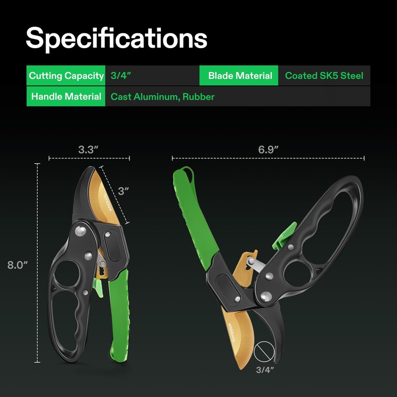 - Durable & Sturdy Construction: Crafted from ultra-sturdy SK5 steel with a non-stick coating, our blades are rustproof, corrosion-resistant, and easy to clean; The cast aluminum handles provide exceptional durability, effortlessly slicing through branches up to 3/4" thick without breaking or cracking
