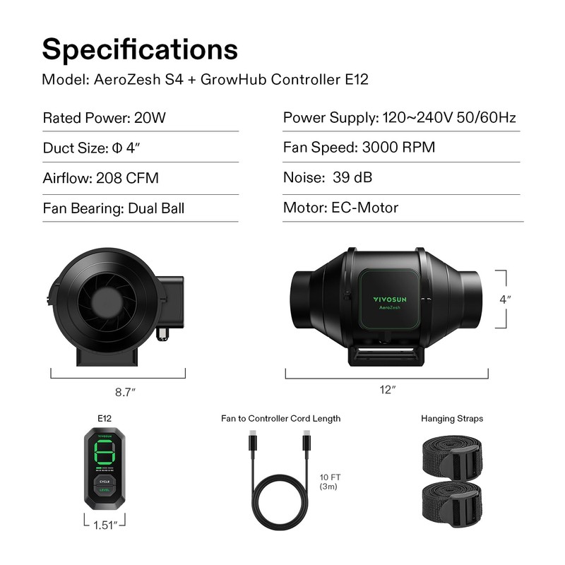 - Efficient Ventilation: The AeroZesh S4 has powerful performance with airflow at 208 CFM to create optimal ventilation for your grow space; A PWM controlled EC fan with mixed-flow design that is fully adjustable and responsive to the environment