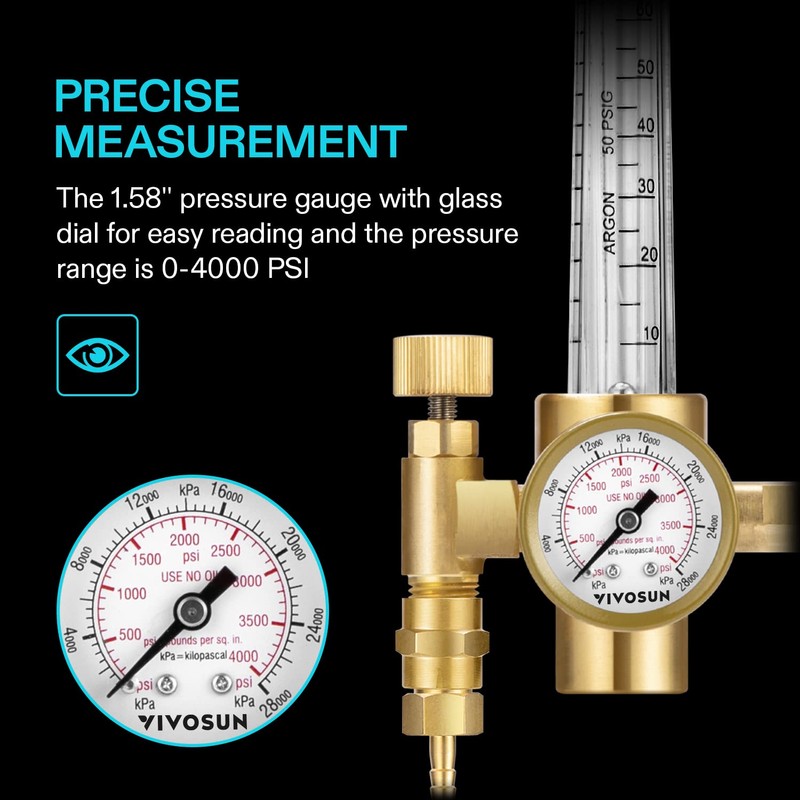 - Precise Control and Measurement: This regulator equipped with a flow meter and pressure gauge; Output flow is indicated by a ball in the flow tube and is adjustable from 10 to 60 SCFH; The pressure gauge ranges from 0 to 4000 PSI and is used to read the amount of gas remaining in the tank