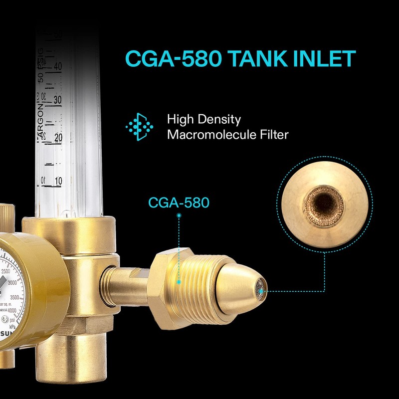 - CGA-580 Tank Inlet: The regulator fits standard Argon and CO2 gas tanks with CGA-580 inlet connection, and has a unique filter port design on the CGA-580 mounting port