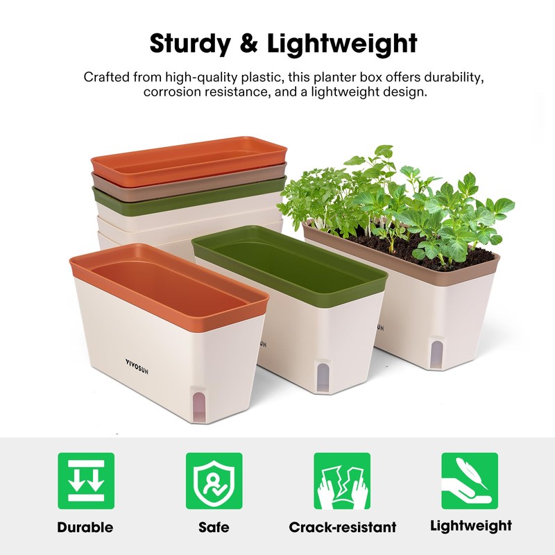 VIVOSUN Self-Watering Planters, Compact Rectangular Window Herb Planter Box with 10 PCS Plant Labels, Plant Container for Basil, Flowers, Succulents, Indoor & Outdoor, 6-Pack