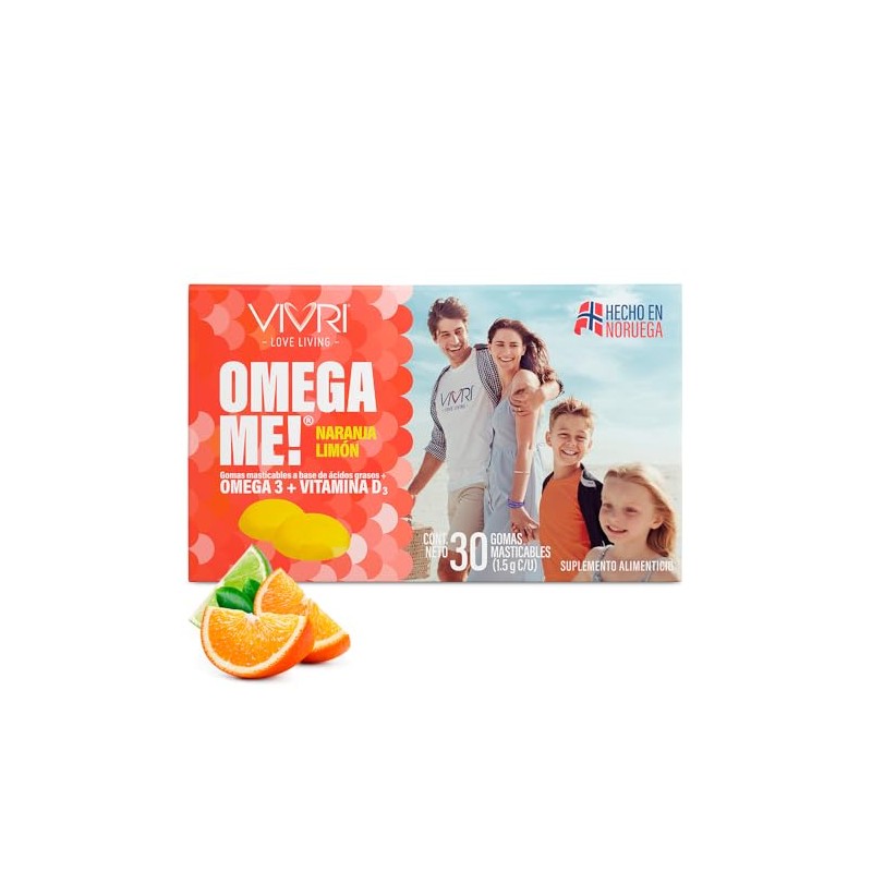 VIVRI Omega Me Suplemento Alimenticio de Omega-3, EPA, DHA y D3 30 Gomitas Suaves Sabor Naranja-Limn Sin Azcar hechas para Nios y Adultos