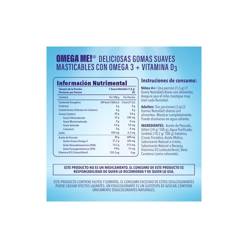 VIVRI Omega Me Suplemento Alimenticio de Omega-3, EPA, DHA y D3 90 Gomitas Suaves Sabor Naranja-Limn Sin Azcar hechas para Nios y Adultos