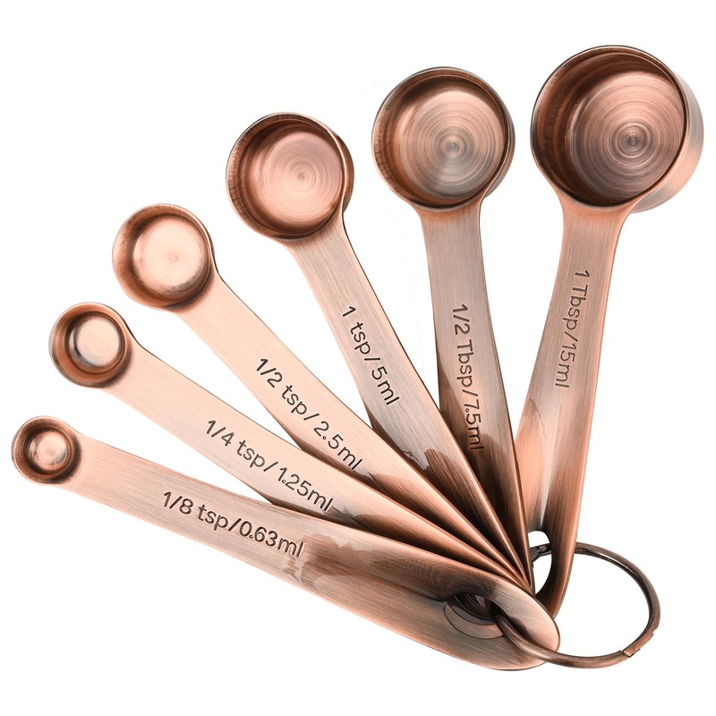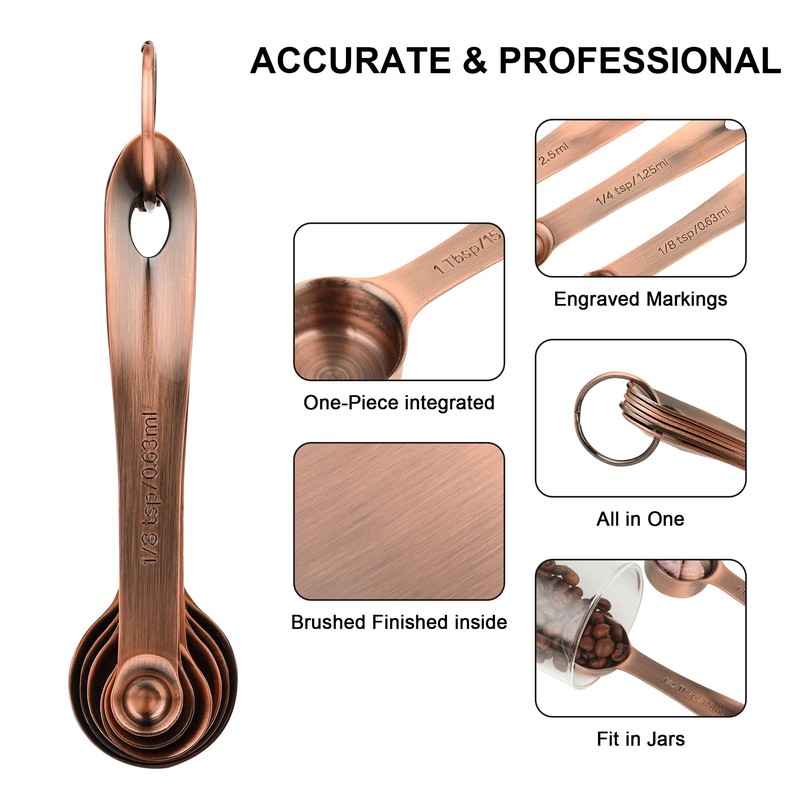 1tsp-5ml; 1/2tbsp-7.5ml; 1tbsp-15ml; 1 measure equivalents & 2 Locking Rings - Use with easy: The copper measuring cups and spoons set belongs in every person’s