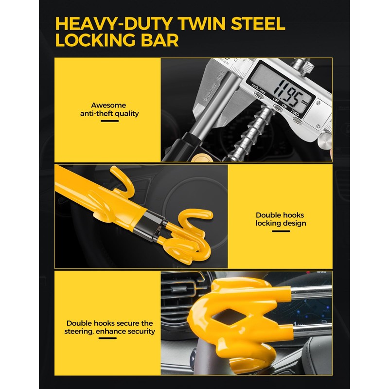 - 【Superior Anti-theft Materials & Design】: Steering wheel locking device makes of high strength steel alloy, effectively resistant to sawing, prying, and other removal efforts. Maximum protect your car. Anti-theft steering wheel lock overall body adopts plastic dipping technology, owe smooth and thicken rubebr surface for protect your steer wheel from scratch. What' more, bright yellow bring highly vision deterrent, enhance anti-thief effect.