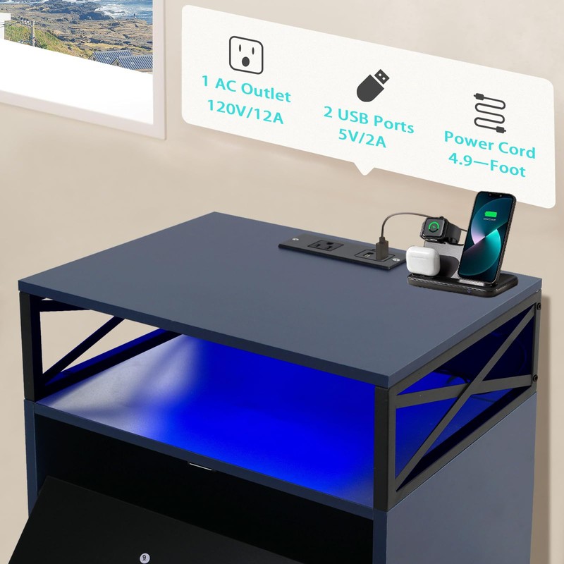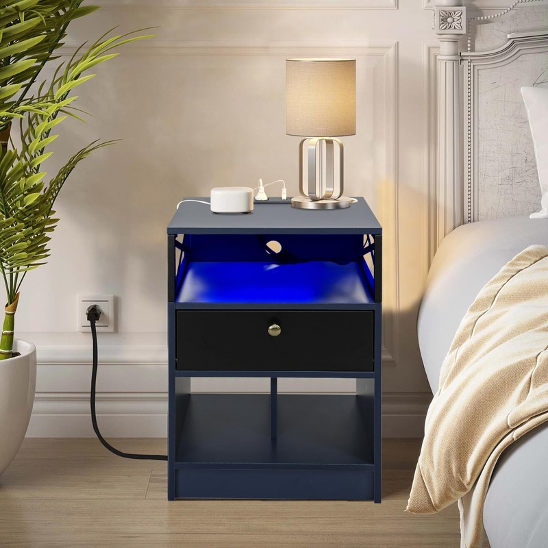 VIWODS Nightstand with Charging Station and LED Lights, Bedside Table with USB Ports and Outlets for Bedroom, Side Table with Storage for Small Spaces, Navy Blue