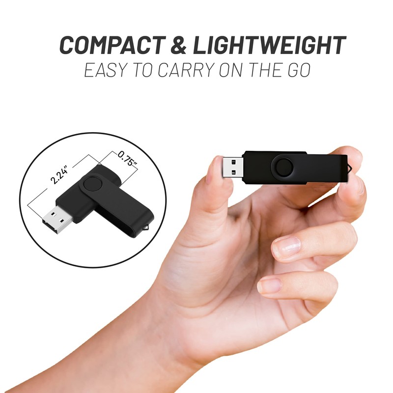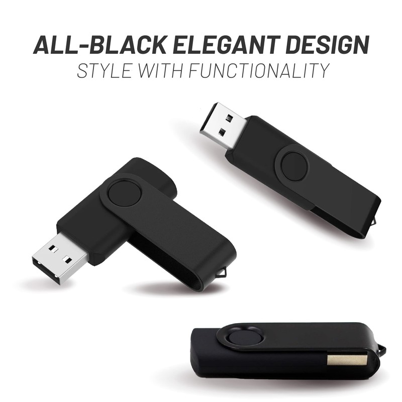 - Stylish 360° Metal Swivel Design: These all-black USB memory sticks feature a sleek 360° metal swivel design, offering robust protection for the USB connector while adding a stylish touch to your tech accessories.