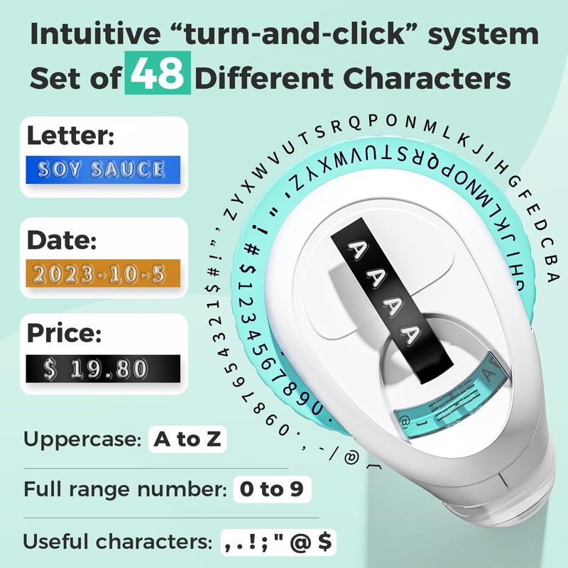 - Simple Label Maker: The Portable Embossing Label Maker with a turn-and-click system simplifies the labeling process, offering 48 useful characters. English letters "A TO Z", numbers : "0 to 9 " , and common symbols " - ! @. , !‘“ $ # ". Sufficient to meet your use needs