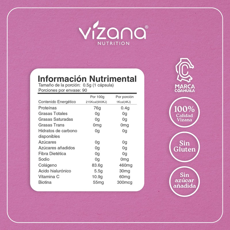 - Biotina con Ácido Hialurónico, Colágeno Hidrolizado y Vitamina C en Cápsulas HPMC Origen Vegetal 90 Caps -500 mg Vizana Nutrition